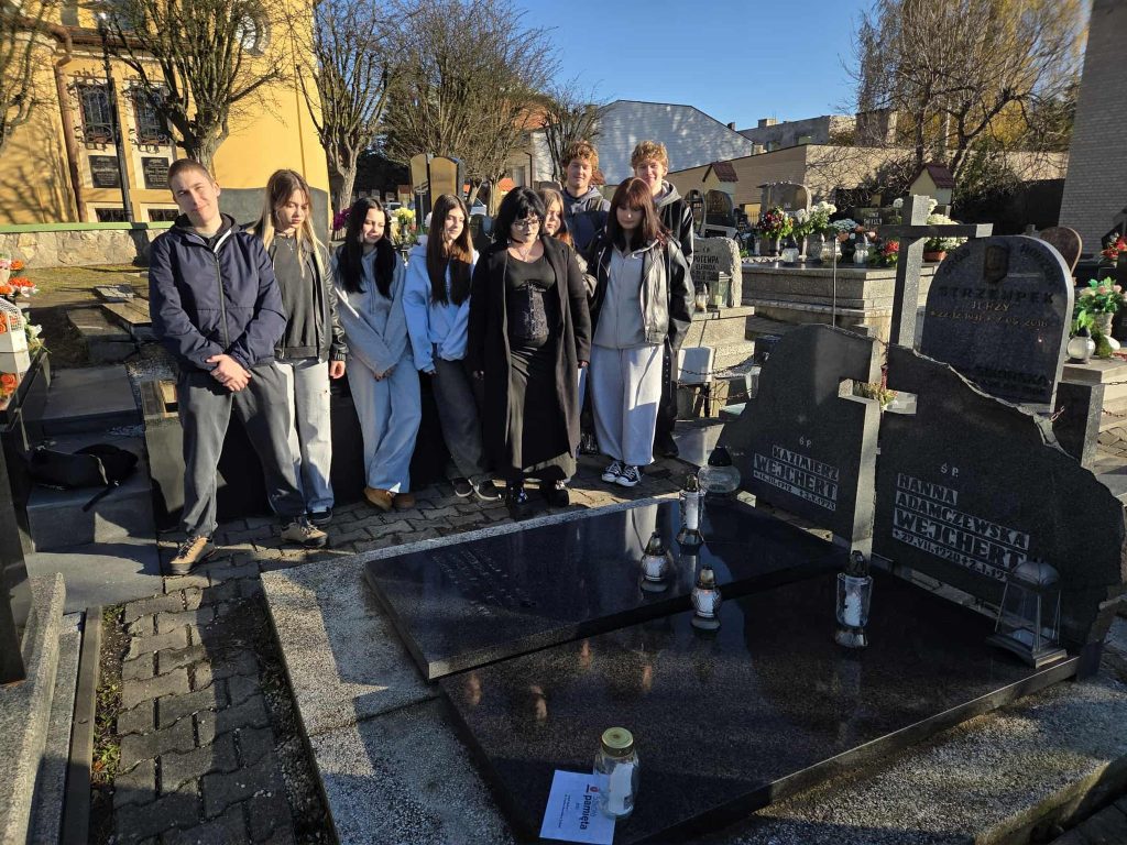 uczniowie klasy 3AB wraz z wychowawcą odwiedzili grób patronów naszej szkoły – Hanny i Kazimierza Wejchertów. Uczniowie uporządkowali miejsce spoczynku i zapalili znicze, oddając w ten sposób hołd osobom, których dziedzictwo jest wciąż obecne w naszej społeczności.